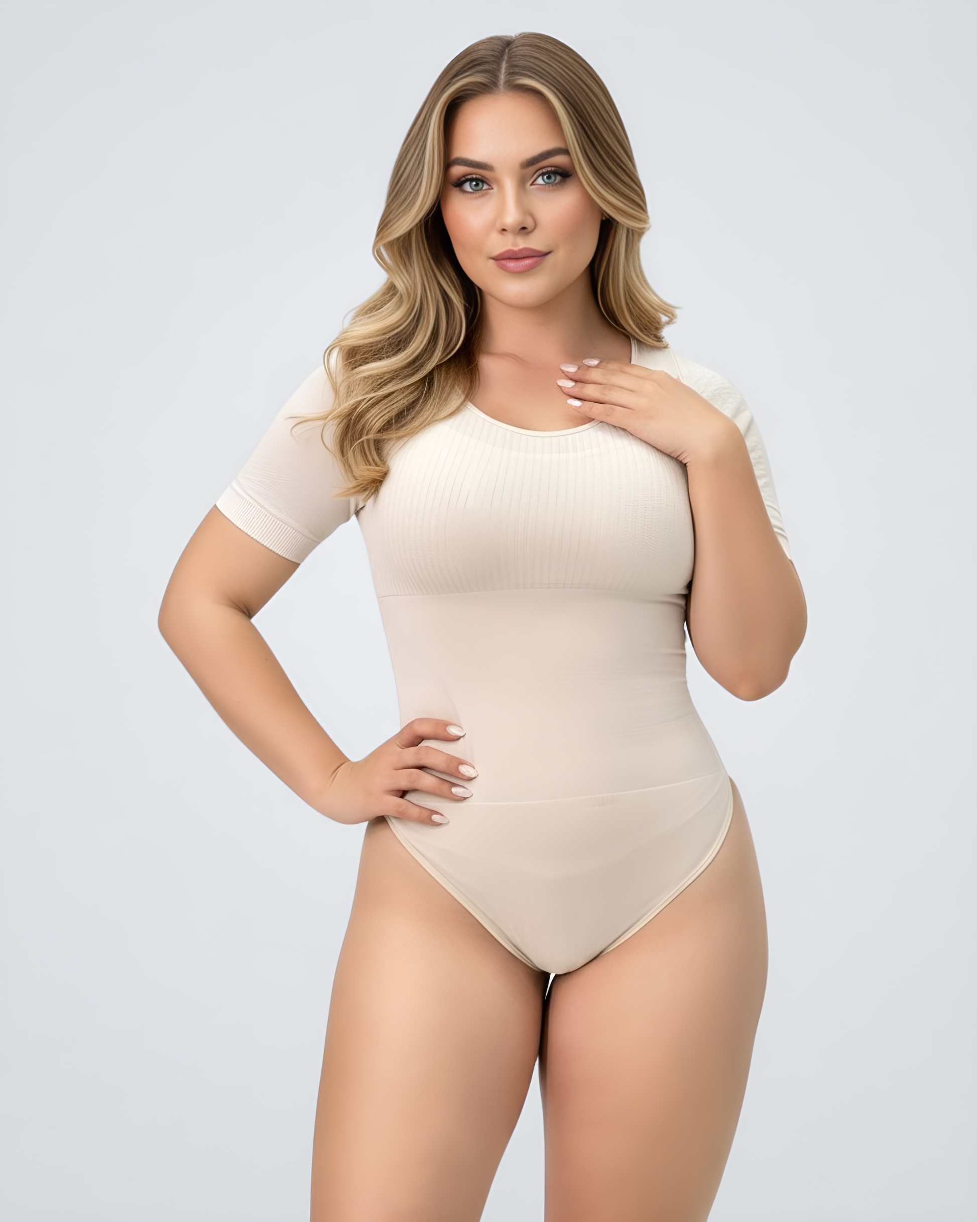 Body de manga corta diseñado para realzar la figura, contraer el abdomen y estilizar la silueta mediante compresión media. Cuenta con broche perineal para máxima comodidad y marcación de cintura que define y moldea la figura de manera natural. Confeccionado para uso diario combinando control corporal y comodidad, permitiendo lucir espectacular con cualquier outfit gracias a su diseño versátil y funcional.