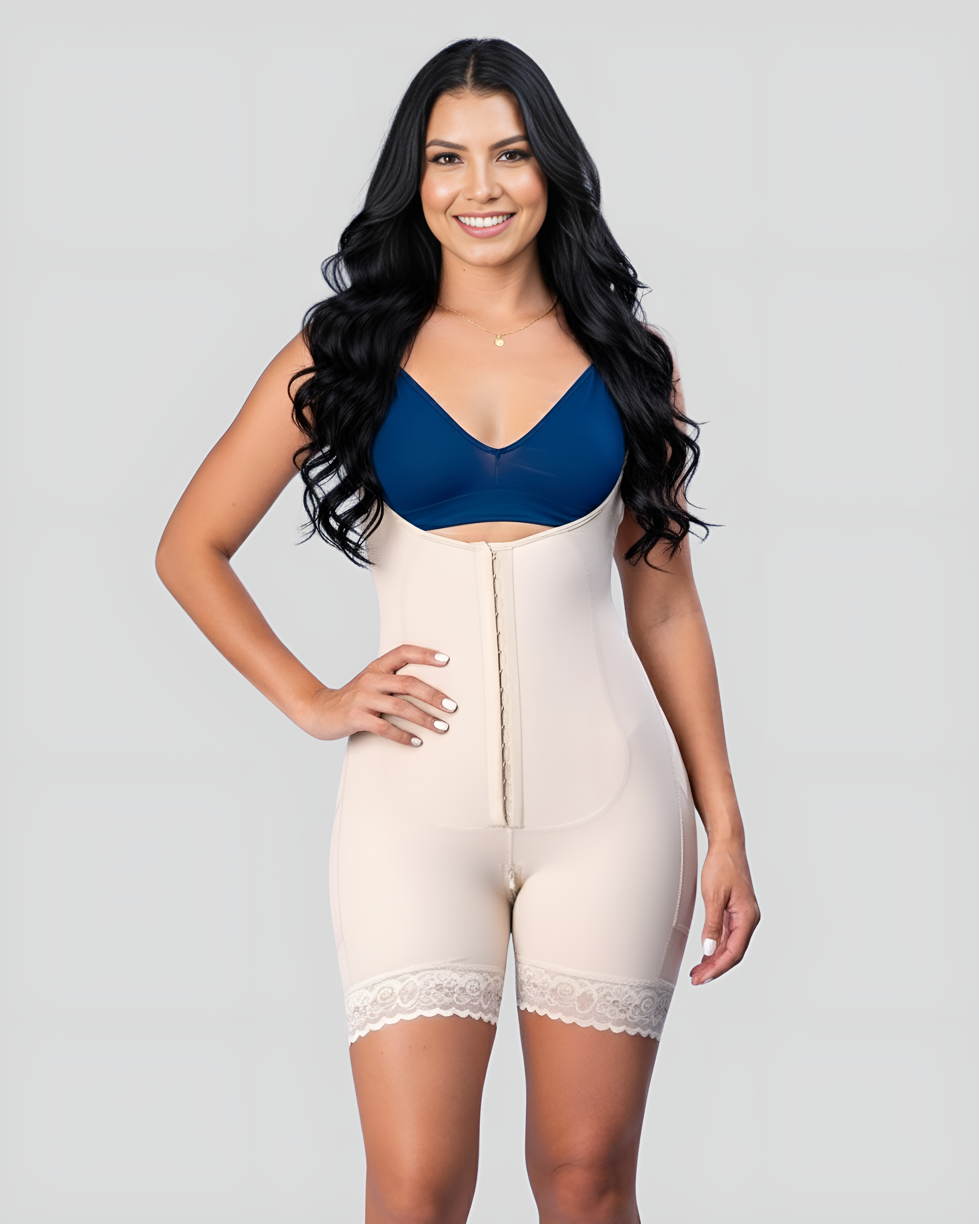 Fabricado en Colombia con materiales de alta calidad (licra spandex y nylon premium). La faja cuenta con compresión graduada, cierre perineal y tirantes ajustables ideal para uso diario y postquirúrgico. El top y las medias proporcionan realce natural y beneficios terapéuticos para mejorar la circulación.
