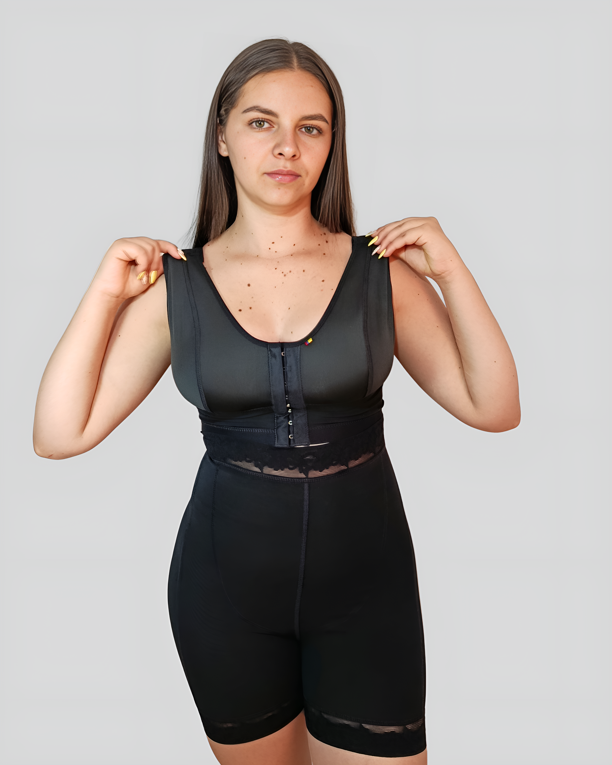 Short moldeador de tiro alto con cobertura desde abdomen medio hasta ka mitad del muslo. Doble refuerzo abdominal en powernet que controla y moldea abdomen alto, medio, bajo y cintura. Incluye realce natural de glúteos y blonda siliconada antideslizante.